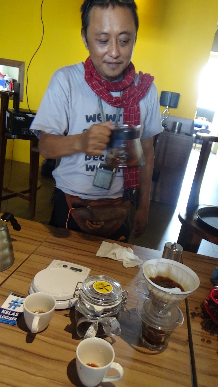 Tidak lupa kang Dudi juga memperlihatkan cara menyeduh kopi dengan unik. Kata kang Dudik, kopi itu rasanya bisa berubah-ubah tergantung dengan cara pengolahannya. Rasanya kalau nyeduh kopi buat suami di rumah, tinggal tuang kopi dalam sachet ke cangkir ya Moms. Nggak ngerti perbedaan rasa kopi, tinggal minum, hihi..