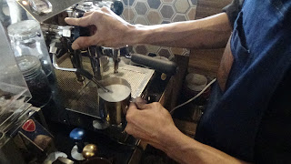 Selain itu saya juga tidak melewatkan kesempatan untuk melihat secara langsung. Moms, bisa bayangin proses pembuatan dan penyajian cappucino? Bagaimana caranya cappucino sehingga bisa dihias dengan cantik di cangkir. Ternyata agak rumit pembuatannya, bahkan peracik kopinya sampai membuang kopi yang busanya terlalu banyak, katanya busanya terlalu tebal sehingga tidak bisa dibentuk atasnya. Duh, segitu detilnya, ternyata tidak mudah membuat gambar di atas busanya. Pantes ya Moms, kita biasanya sayang minum cappucino-nya, takut merusak gambarnya.