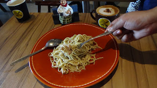 Sementara kita, para peserta bersemangat memfoto-foto. Kolary Coffee & Kitchen juga bersemangat menghidangkan beraneka ragam menu makanan dan minuman Moms, untuk difoto. Aduh, itu menu-nya enak-enak banget, selama mem-foto, rasanya perut keroncongan, hihi… Akhirnya nggak tahan buat nyicipin spaghetti-nya. Ini mau belajar food fotography atau makan-makan? Wkwkwkw…