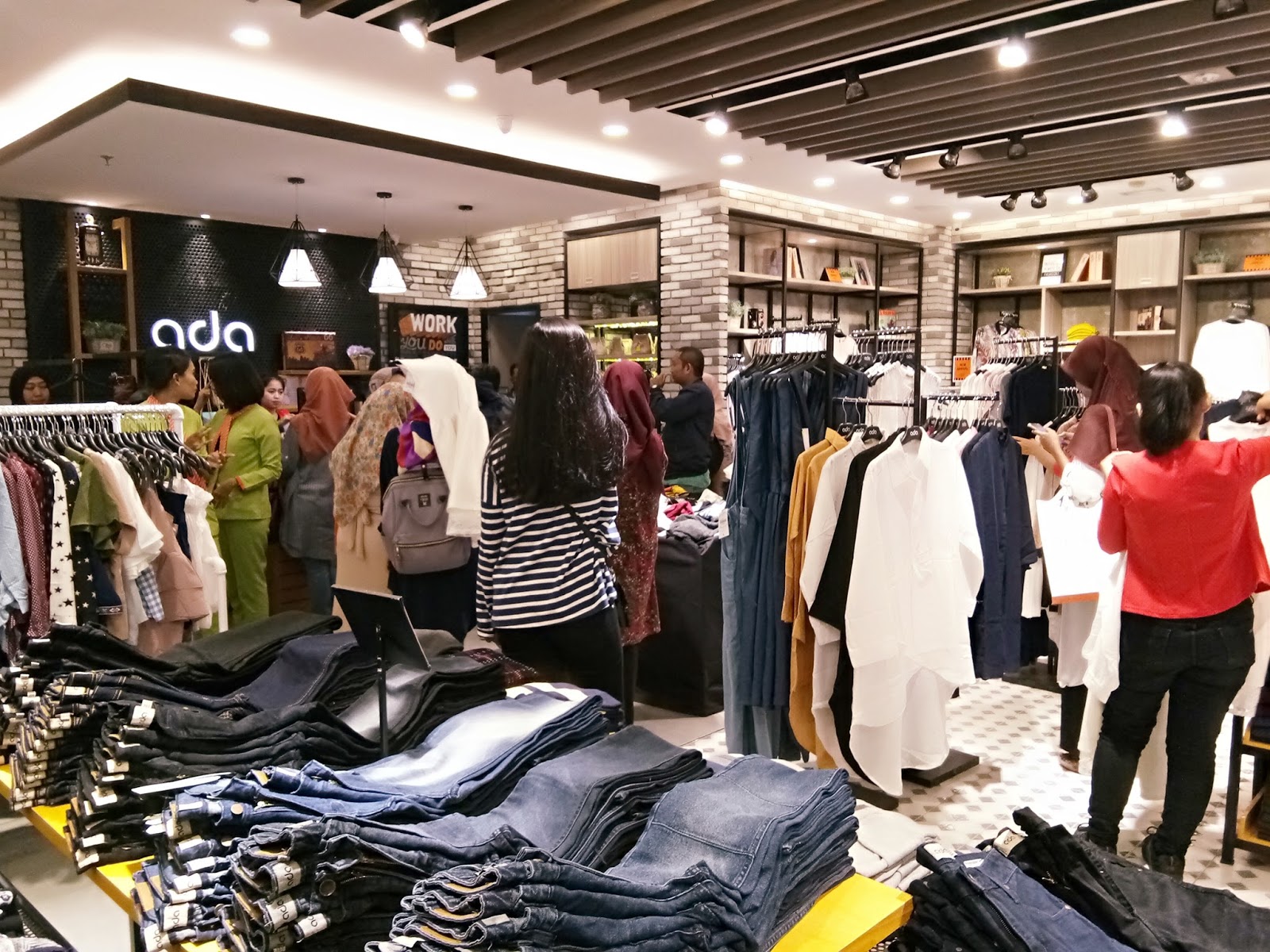 Langsung deh, semua pengunjung melihat-lihat koleksi ADA Store yang terdiri dari jumpsuit, tas, dress, gaun, kaus, jaket, kemeja, dan lain-lain. Rasanya pegang ATM kalau begini, bisa-bisa beli semua. Apalagi barang diskonan, kok rasanya mau beli banyak aja! Lumayan hemat, jadi nggak usah belanja buat lebaran lagi, kalau harganya sesuai dan bajunya cakep. Daripada beli pas puasa, pastinya harga-harga baju mahal, ditambah lagi laper mata pas buka puasa. Duh, mendingan ibu hemat, di rumah aja pas puasa, biar nggak keluar uang buat beli baju lebaran.
