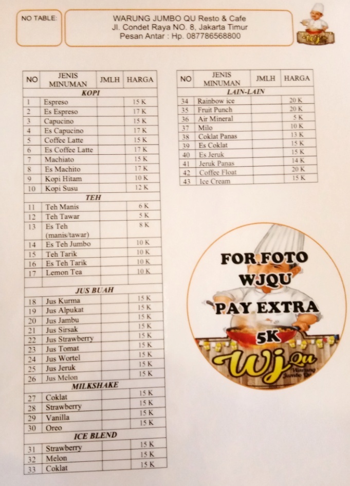 Sayangnya  saya tidak tahu makna dari gambar foto di menu makanan, dengan tambahan 5 ribu. Saya pikir itu foto di booth cafe, ternyata foto print wajah untuk minuman kekinian di Wjqu, cafe untuk keluarga.