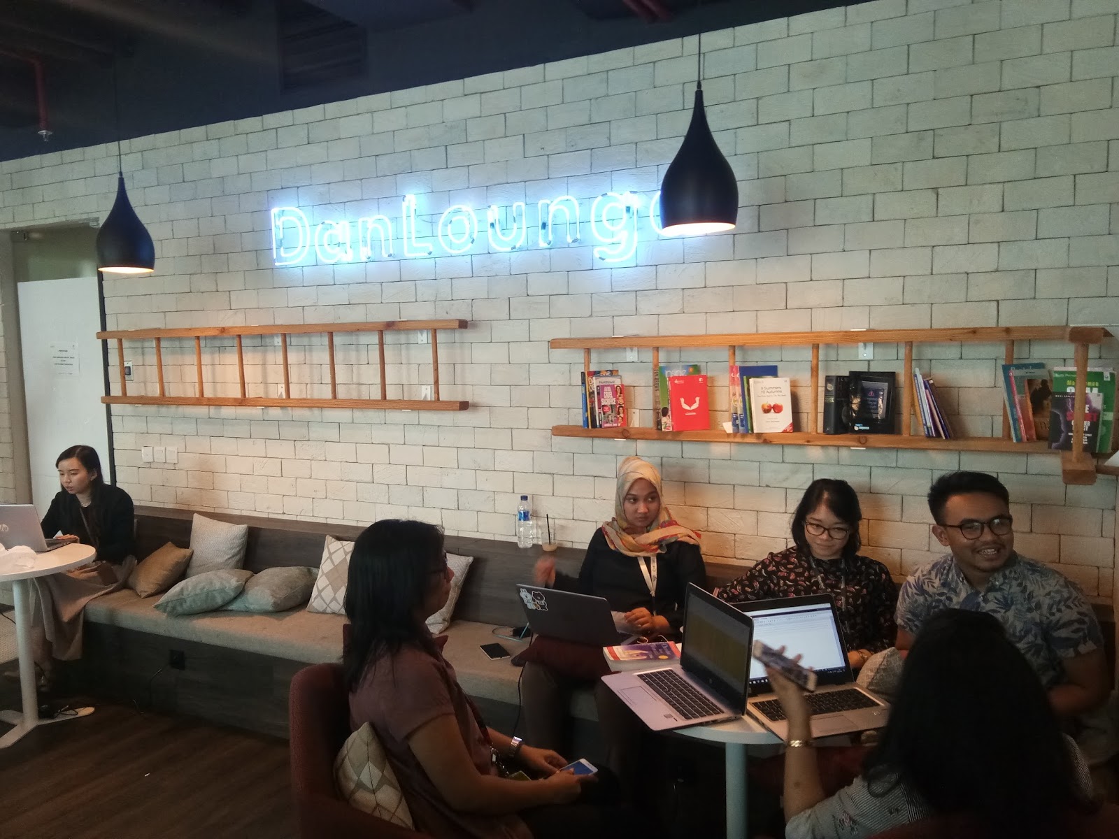 - Danlounge, cowork dengan banyak spot, seperti counter snack sore, sofa dengan main playstation, sudut perpustakaan dengan kaca langsung keluar.