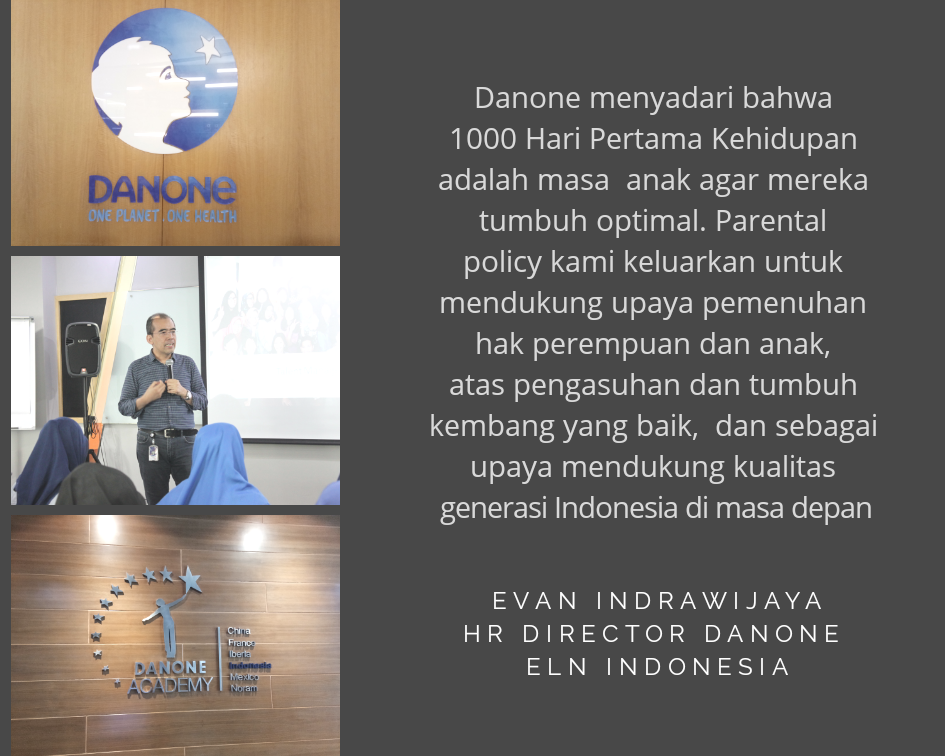 Ternyata di Danone, perempuan itu mendapatkan kedudukan yang layak. Dengan parental policy, perempuan mendapatkan 6 bulan cuti melahirkan dan bagi laki-laki cuti 10 hari. Wah enak banget. Ternyata Danone peduli pada 1000 Hari Pertama Kelahiran bayi, yang memang sangat penting bagi pertumbuhan bayi. Kalau saya jadi karyawan Danone pasti senang banget, secara 6 bulan digaji penuh tapi cuma di rumah ngurus bayi, sambil shopping, hehe..