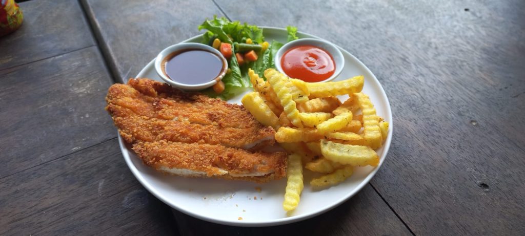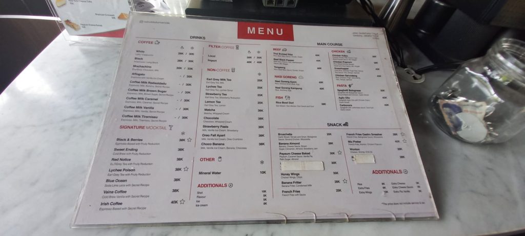 Untuk makanan, porsinya lumayan besar dan lengkap. Kami memilih chicken katsu dengan french fries, karena sudah makan siang. Minumannya kami memilih iced coffee brown sugar dan earl grey tea. Rekomen banget chicken katsunya seharga 38 ribu, untuk kopinya lumayan seharga 30 ribu, tapi tehnya seharga 20 ribu agak terasa asing di lidah.